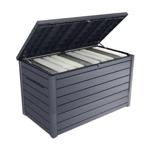Keter Northwood putekasse med volum på 630 liter i grå plast. Kassen har horisontale paneler og lokk som kan åpnes fra toppen. Egnet for oppbevaring av puter, hageutstyr og annet tilbehør utendørs. Materialet er vedlikeholdsvennlig plast som er tilpasset bruk på terrasse, balkong eller i hage.
