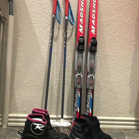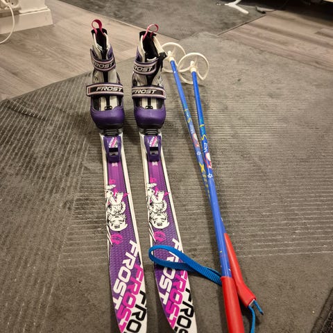 Barneski 90 cm, skistaver 70 cm og skisko str 29