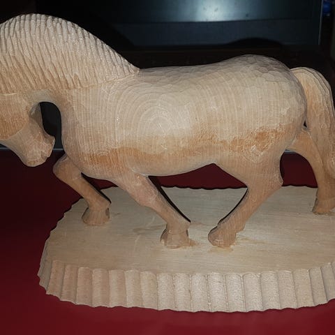 Trefigur formet som en hest i oppreist positur. Figuren er malt i flere farger, blant annet rød, gul, grønn og blå, med detaljer som sal og hodelag. Passer som dekorasjonsgjenstand i hjemmet eller som samleobjekt. Størrelse ikke oppgitt.