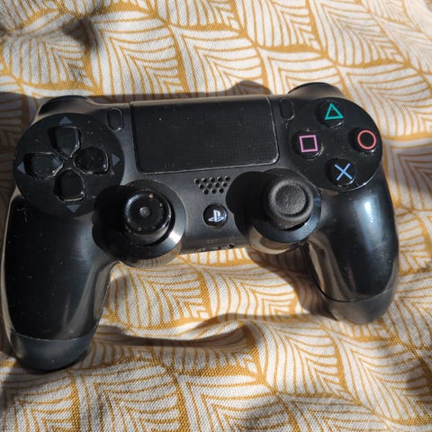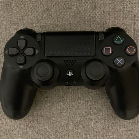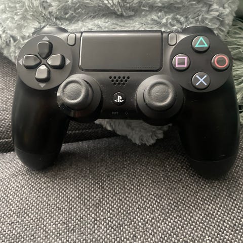 Sony DualShock 4 trådløs kontroller i svart. Standard PlayStation 4‑kontroller med to analoge styrespaker, retningsknapper, fire frontknapper, skulderknapper og triggere. Kontrolleren har innebygd berøringsplate, lysstripe, høyttaler og 3,5 mm hodetelefonutgang. Egnet for bruk med PlayStation 4‑konsoller og kompatible enheter som støtter DualShock 4.