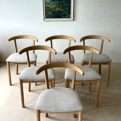 Stoler: Modell SM52. Stolene er pusset ned og såpevasket. Seter omtrukket i Amdal 325 fra Gudbrandsdalens Uldvarefabrikk. Stoffet er i ull og er svært slitesterk.