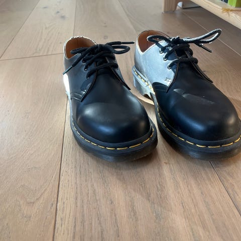 Dr. Martens sko i størrelse 37. Modellen er lave snøresko i svart farge med karakteristiske gule sømmer rundt sålen. Overdelen har flettet detalj i front og metallhemper til skolissene. Kraftig yttersåle i gummi med mønster for godt grep. Passer til hverdagsbruk og som en robust sko til ulike antrekk.