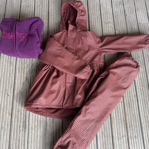 Regnsett fra OkiDoki i str 110 selges for 80 kr. Sandmerker og fotstrikkene er slitt så bør settes på nye, ellers ingen anmerkninger.