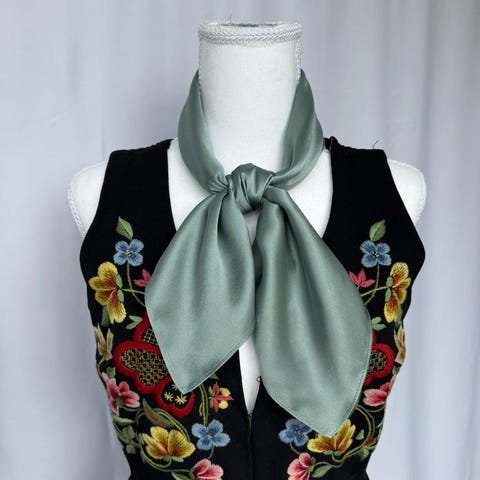 Flott mosegrønn farge. Mykt og behagelig skjerf. Passer veldig fint til bunad også. Dette er er riktig størrelse om man ønsker å putte endene inn under fronten på bunaden. Skjerfet er i Mulberry silke som er den beste silke kvaliteten. 100% silke. Helt som nytt. Størrelse 68x68 cm. Kan gjerne sende med posten til 46.- så sparer man litt på frakten.