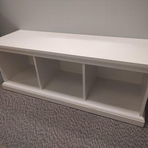 Godt brukt hylle med fin oppbevaringsplass. Den har en del merker osv men fungerer fint. Ca 1 m høy