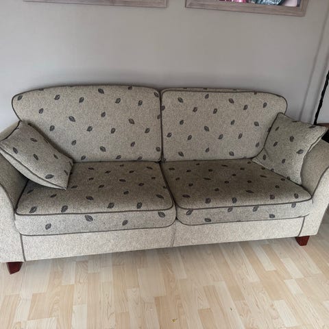 Beige 3+2 seters sofa med mønstret tekstiltrekk