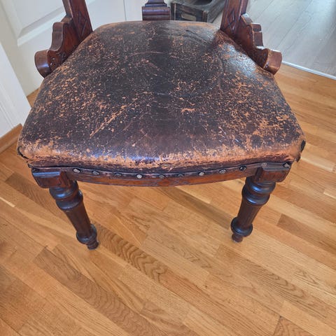 To vakre stoler med håndbrodert rosemønster på lys bakgrunn og elegant buet ramme i mørkt treverk. Kan passe som sittemøbler i stue. Kr. 500 per stk..