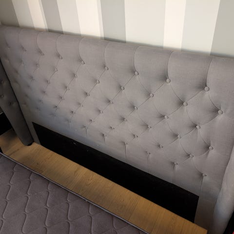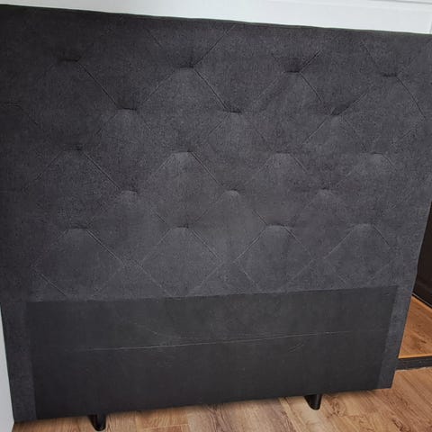 Bohus sengegavl i grått tekstil. Sengegavlen har polstret, knappestoppet front og rette linjer. Den er beregnet for plassering bak seng og gir støtte ved sitting i sengen, samt beskytter veggen bak. Passer til soverom der man ønsker en tekstiltrukket gavl med nøytralt uttrykk. Prisen er ferdig prutet!