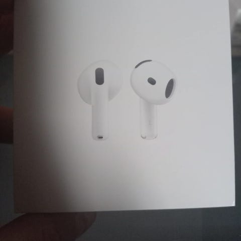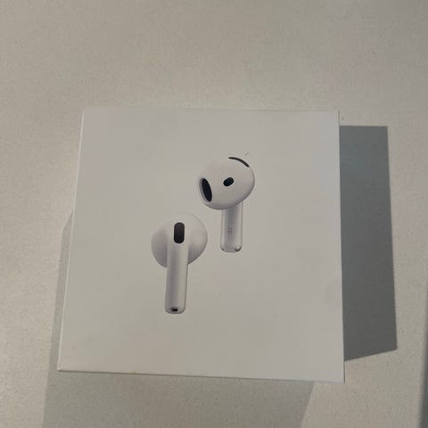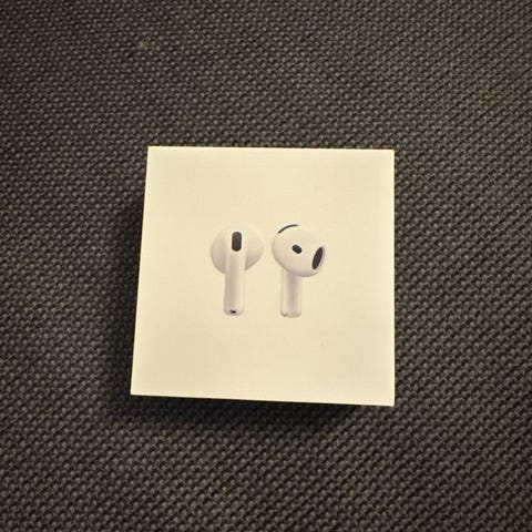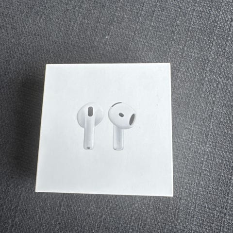 Uåpnete Apple AirPods 4 trådløse ørepropper i hvit farge. Modellen er A2031/A2032, som vist på esken. Øreproppene kobles trådløst til kompatible enheter via Bluetooth og leveres med ladeetui som støtter lading via Lightning-kabel. Designet med innebygde mikrofoner og sensorer for håndtering av musikk og samtaler. Passer til generell bruk som musikklytting, telefonsamtaler og medieavspilling på kompatible Apple-enheter og andre enheter som støtter Bluetooth-tilkobling.