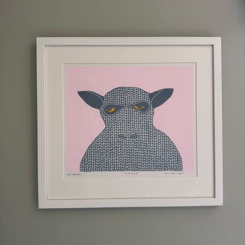 Jeannie Ozon Høydal Knit Wit II silketrykk med motiv av sau i brun genser mot lys bakgrunn. Bildet er signert av kunstneren og innrammet i en enkel, hvit ramme med passepartout. Kunsttrykket egner seg som veggdekor i stue, gang, kontor eller andre oppholdsrom.