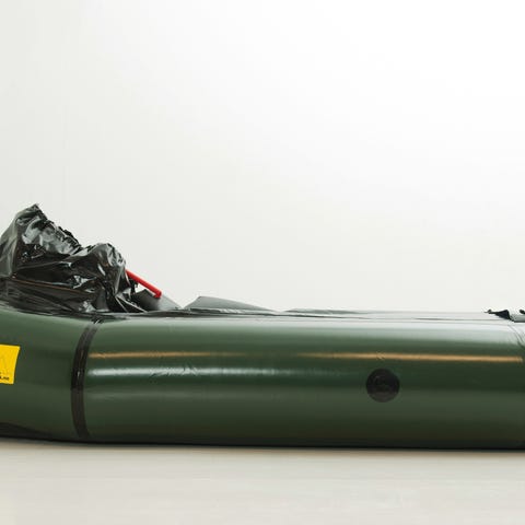 Oppblåsbar gummibåt i grønn farge. Båten har avlang, oval fasong med oppblåsbare sider og bunn. Den egner seg til bruk på stille vann som innsjøer eller rolige elver. Det er festepunkter på sidene som kan brukes til tau eller enkel sikring av utstyr. Materialet er glatt og lett å tørke av etter bruk. En person veier