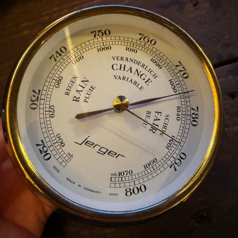 Barigo barometer i messing. Rundt veggmontert barometer med hvit urskive og svart skala for måling av lufttrykk i hPa og mmHg. Skiven har tekst på tysk (Regen, Veränderlich, Schön) og viser trykkverdier fra ca. 960 til 1060 hPa. Kabinettet er i polert messing med frontglass og festeører for montering på vegg, for eksempel innendørs eller i båt. Egnet for enkel avlesning av vær- og trykkendringer.