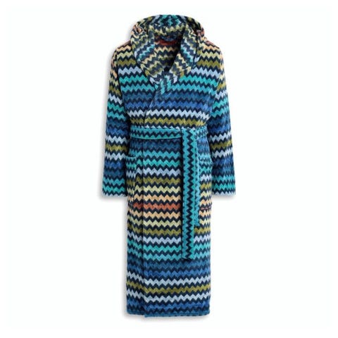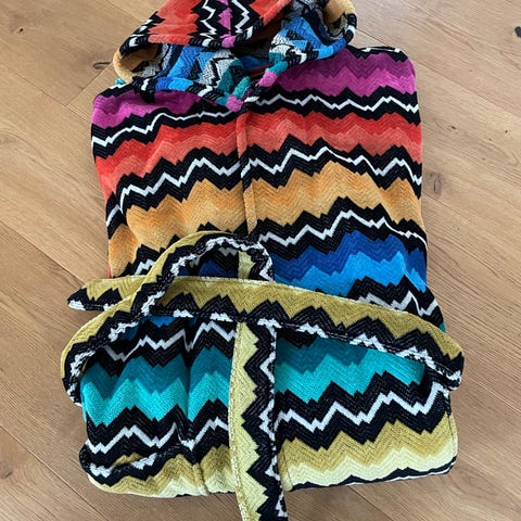 Missoni morgenkåpe, str. M (dame). Laget i bomull med det klassiske flerfargede sikksakkmønsteret i farge Giacomo. Har hette og belte i livet for justerbar passform. Helt ny, kjøpt i Missoni-butikken i Roma i januar 2026.