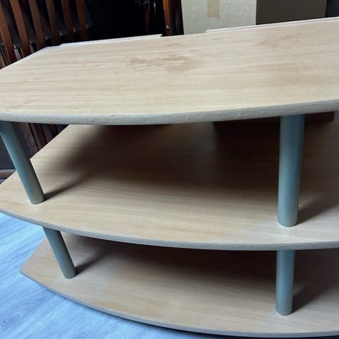 Glassbord i tre etasjer, brukt som tv-bord. Metallben