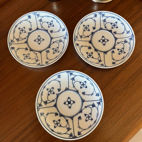 4 stk kaffekopper/tekopper med skåler/tefat. Alle i god stand, men et merke i glasuren på innsiden av den ene koppen (se bilde).