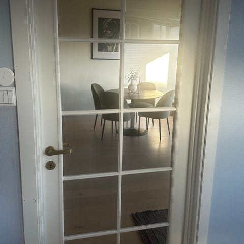 Innerdør med hvit overflate og glassfelt i øvre del. Døren leveres med dørhåndtak og nøkkelhull. Egnet som innvendig dør mellom rom der man ønsker lysgjennomgang samtidig som man beholder en viss skjerming.