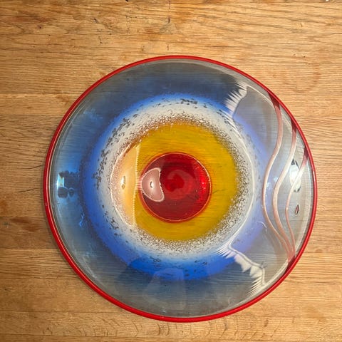 skål i frostet glass med rosemotiv i bunnen. Skålen er rund og har en diameter på omtrent 16 cm, som vist på bildet med målebånd. Passer til servering av snacks, dessert eller som dekorativ skål i hjemmet.