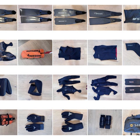 Utstyret er laget i neopren og plast/gummi, tilpasset bruk i kaldt vann. Passer til fridykking, snorkling og undervannsjakt der det er behov for god isolasjon, flyte- og vektkontroll samt praktisk transport og oppbevaring av utstyret.