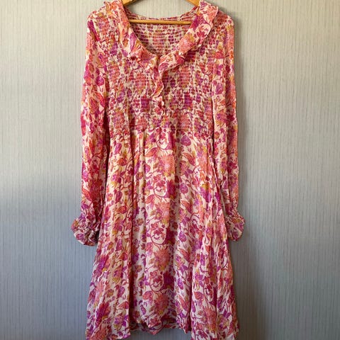 Claire sommerkjole kjole i størrelse 36 for dame. Kjolen er rosa og laget av 100 % bomull. Modellen har kort pufferm og rynket overdel med utsvingt skjørt. Passer som lett sommerkjole i hverdagen eller til enkle anledninger.