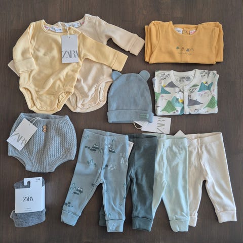 H&M og KappAhl å newbie babyklær for gutt i størrelse 62. Pakken inneholder ulike plagg i flere farger og mønstre, blant annet bodyer, gensere og bukser. Klærne er i myke materialer som passer til hverdagsbruk for baby. Fargene er hovedsakelig nøytrale og duse toner kombinert med noen plagg med trykk og motiver. Passer til babygutt rundt størrelse 62.