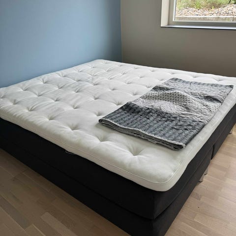 Selger gjestesengen vår, kjøpt ny på Eureka for ca 5 år siden. Grå velur med brune trebein. Størrelse 180 x 210 cm og ca 65 cm høy. Må hentes
