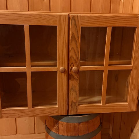Kvitbeisa eikemønster med kvite skuffer. To hyller i skapet.