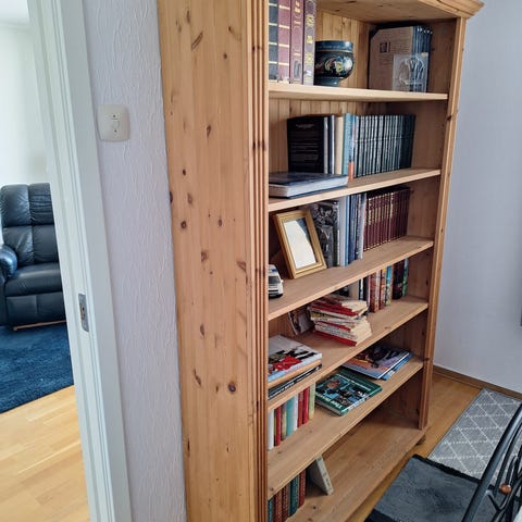 GRATIS Skrivebord i heltre furu. Bordet har bordplate og understell i tre med naturlig trestruktur. På venstre side er det åpne hyller og skuffer for oppbevaring av bøker, dokumenter eller annet utstyr. Egnet som arbeidsbord eller lekseplass på kontor, soverom eller barnerom. Nøytral treutførelse som passer inn i ulike innredningsstiler. Stol følger med mot henting.