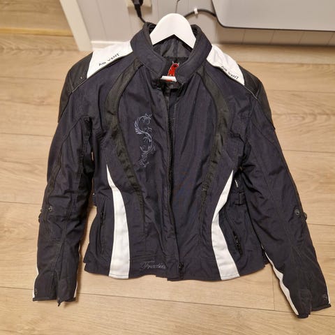 Sweep MC jakke for dame i størrelse 36. Kjøpt på Bullfighter.no. Beskyttelsesinnlegg i rygg, skulder og albueområdet. Egnet som kjørejakke til motorsykkel og scooter. Ingen skade, kun litt «skitten» her og der som kan vaskes bort. Selges til førstemann. Pris kan diskuteres