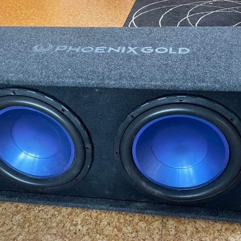 Phoenix Gold subwooferkasse med to Ground Zero subwoofere. Kassen er trukket i grått teppe og har to runde subwoofere montert i front. Tilkoblingspunkt er plassert på siden av kassen.