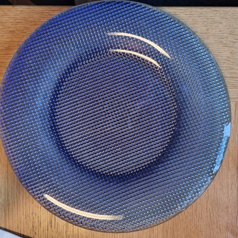 Magnor Glassverk fat i blått krystallglass. Håndlaget blykrystall (24 % PbO) med mønster på undersiden som gir en strukturert overflate. Fatet egner seg til servering av frukt, kaker eller som dekorasjonsfat på bord eller benk. Klassisk norsk glassdesign fra Magnor Glassverk.