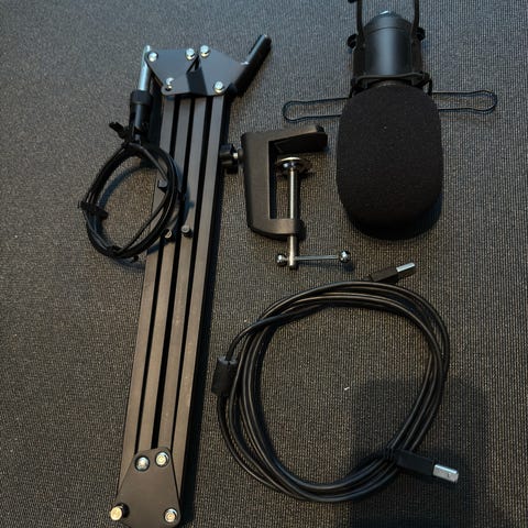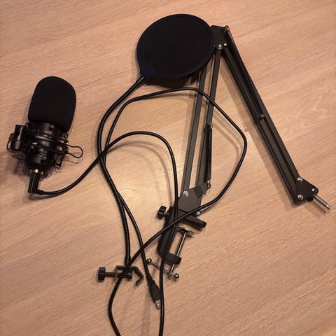 Mikrofon med bordstativ og popfilter. Settet består av en dynamisk eller kondensatormikrofon med skumvindhette, støtdempende oppheng/feste, bordstativ og separat popfilter med fleksibel arm og bordfeste. Egnet for taleopptak, streaming, gaming eller enkel musikkinnspilling. Tilkobling via XLR-kontakt på mikrofonen. Farge: svart.