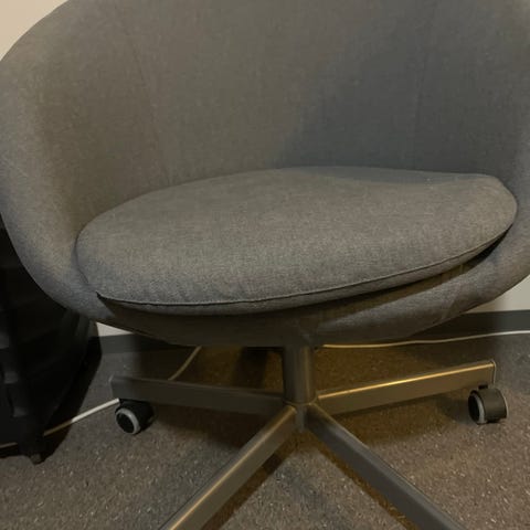 IKEA kontorstol med fotstøtte i svart tekstil. Stolen har polstret sete og separat polstret fotstøtte montert på siden. Understell med hjul og dreiefunksjon for enkel forflytning. Egnet som arbeidsstol eller kontorstol i hjemmekontor eller på arbeidsplass.