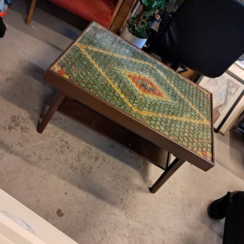 Liten trekrakk med broderi . Perfekt til å hvile beina på.