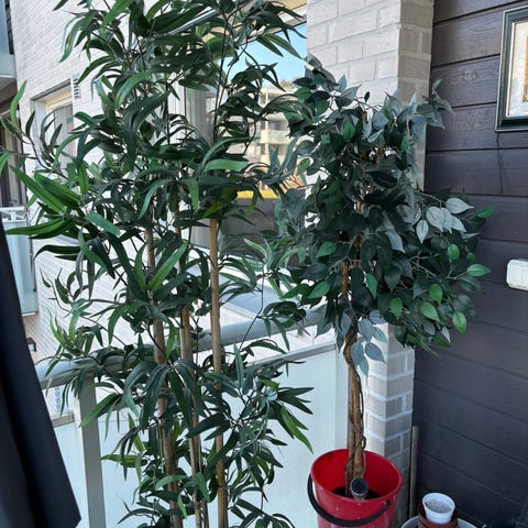 Grønn stueplante i potte med lange, smale blader og blankt, mørkegrønt bladverk. Egner seg som inneplante i stue eller andre oppholdsrom. Planten trives vanligvis lyst, men uten direkte, sterk sol, og vannes jevnlig når jorden har tørket lett opp mellom vanningene. Passer som dekorativ grønn plante i hjem eller kontor. Prisen gjelder begge plant