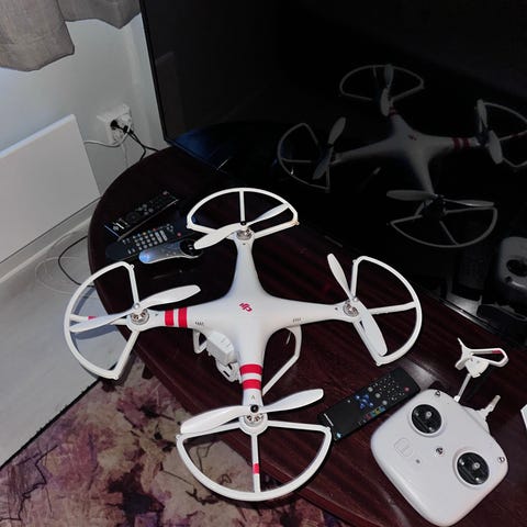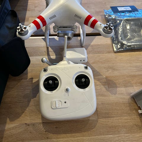 Dronen leveres med tilhørende fjernkontroll og flere sett propeller, som vist på bildene. Kroppen har synlige merker og sprekk i skroget men dronen fungerer akkurat som den skal ikke noe problemer. Undersiden har montert kameramodul/gimbal. Det følger med formstøpt koffert/etui til oppbevaring og transport.