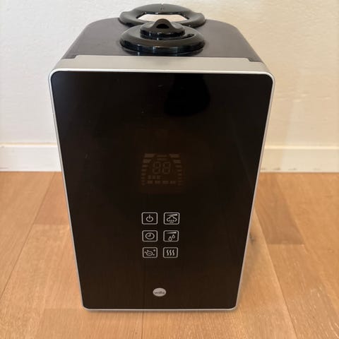 Wilfa luftfukter i svart utførelse. Enheten har berøringspanel i front med flere funksjoner og innstillinger, samt gjennomsiktig vanntank som gjør det mulig å følge med på vannstanden. Passer til innendørs bruk for å tilføre fukt til romluften. Drives med strøm via ledning.