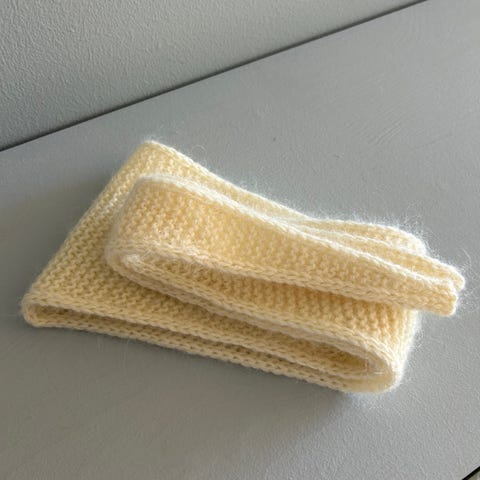 Nydelige sophie scarf fra PetiteKnit strikket i dobbelttråd med Dale Alpakka Forte 80% fineste alpakka og 20% nylon i fargen natur, og Tynn Kidsilk Erle 53% kid mohair, 34% silke og 13% ull i fargen beige