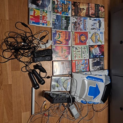 Pakken inneholder to retro spillkonsoller med tilbehør. Øverst på bildene vises en eldre TV-spillkonsoll med strømforsyning og joystick-kontroller. Nederst vises en moderne plug-and-play TV-spillkonsoll med blå og svart hovedenhet, håndkontroller, strømadapter og kabler, samt original emballasje. Konsollene kobles til TV og er egnet for enkel spilling med medfølgende kontroller. Nøyaktig modellbetegnelse og spillutvalg fremgår ikke av bildene og bør eventuelt avklares med selger. De to maskinene fungerer ikke.