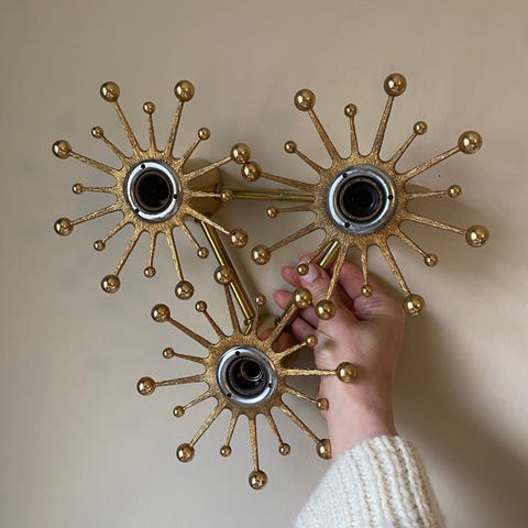 Sputniklampe fra norske Nipro ca 1970. Måler ca 40 cm i diameter. Den virker og leveres med en eldre type dimmer. Denne kan selvfølgelig fjernes. Alle stjernene er inntakte, men en fremstår litt mattere enn de øvrige.