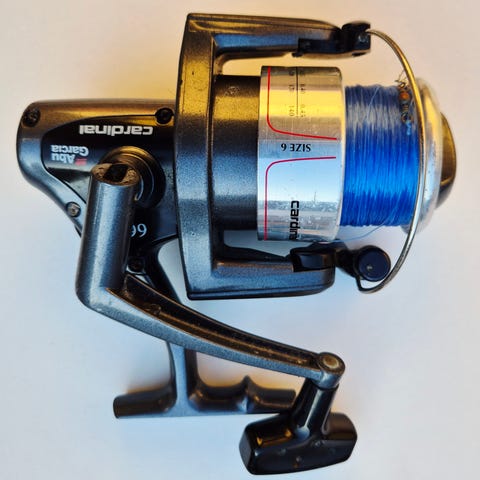 Abu Garcia Cardinal haspelsnelle i svart og rød farge. Snellen er påspolt med sene, og spolen er merket med kapasitet 0,40 mm / 150 m (15 lbs / 165 yds). Utveksling 5,2:1. Egnet til allround fiske der det er behov for relativt kraftig sene og robust snelle.