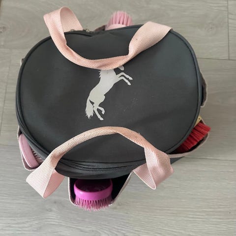 Stellsett til hest med ulike børster og kammer. Inneholder blant annet langskaftet børste, mindre håndbørster med ulike busttyper, kammer i plast og verktøy til hov- eller pelsstell. Egnet til daglig stell og rengjøring av hest og utstyr.