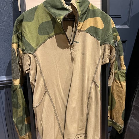 Arc’teryx herre combat shirt i størrelse L (brystvidde ca. 109 cm). Skjorten har kamuflasjemønster på ermer og øvre del, med ensfarget brun front og rygg i mykere stoff. Høy krage med borrelås og knappelukking. Designet for bruk under vest eller ytterlag, med slitesterkt stoff på utsatte områder og mer elastisk materiale på overkroppen for bedre bevegelighet og komfort. Egnet til friluftsliv, skytebane og annen aktivitet der kamuflasje og bevegelsesfrihet er ønsket.