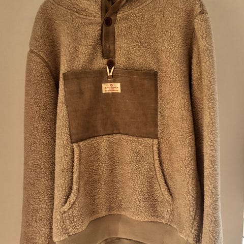 Amundsen hettegenser for herre i størrelse L. Genseren er laget i polyester med teddy/fleece-lignende overflate i beige farge. Modellen har hette, knappestolpe med knapper foran og stor frontlomme med kontraststoff. Egner seg som mellomlag eller ytterplagg i kjøligere vær.