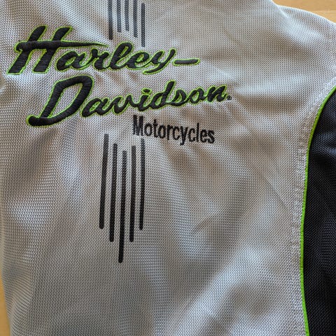 Harley-Davidson motorsykkeljakke i gortex i svart. Jakken har store Harley-Davidson-logoer foran og mindre logo på ryggen. Den er utstyrt med glidelås i front, krage med lukking og flere lommer med glidelås.