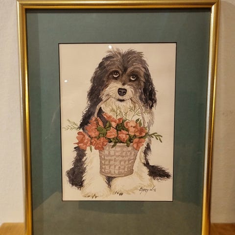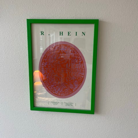 Innrammet plakat med motiv av et rådyr omgitt av pasta og grønnsaker på en tallerken. Bakgrunnen har et blomstermønster i rosa, oransje og gule toner. Bildet er montert i en enkel, mørk ramme.