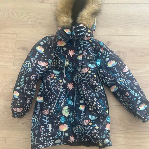 Hummel jakke for jente i størrelse 104. Jakken er flerfarget med blomstermønster og karakteristiske Hummel-detaljer på ermene. Den har hette med fuskepelskant og mykt, fleeceaktig fôr på innsiden for ekstra komfort og varme. Passer til hverdagsbruk og utetid i kjøligere vær.