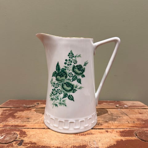 Stor mugge, antagelig til vaskestell fra Colonial Pottery, Stoke England mønster Avon. Med blå blomster. Uten hakk eller sprekker. Litt skjoldete inne i. Sjarmerende