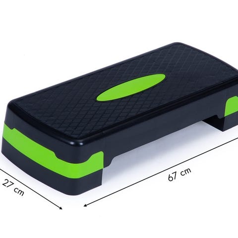 Treningsbenk stepkasse for kondisjons- og styrketrening. Plattform med sklisikkert mønster på overflaten. Justerbar høyde ved hjelp av løse klosser under, slik at intensiteten kan tilpasses. Egnet til step-aerobic, spensttrening, rehabilitering og ulike styrkeøvelser. Flerfarget design i svart, rød og grå.