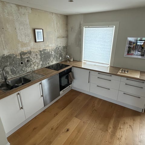 Passer til innredning opp til 140 cm lengde og underskap 60cm. Da blir det plass på baksiden til å sitte inntil øya med bena under platen. Platen har vært montert, men ikke brukt.
