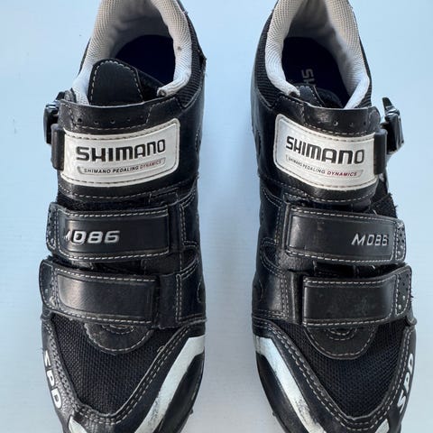 Shimano sykkelsko for terrengsykling i størrelse 41. Skoene har hvit og svart overdel med borrelås- og spenne-lukking for justerbar passform. Overdelen kombinerer syntetisk materiale og mesh for støtte og ventilasjon. Sålen er grovmønstret gummi med feste for SPD-klosser, egnet for bruk med klikkpedaler til terreng- eller tursykling.